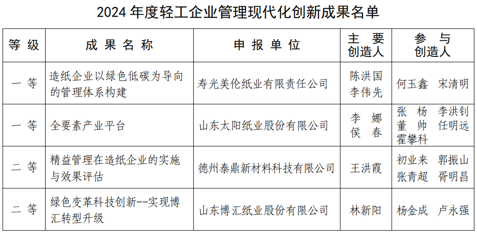 喜报:太阳纸业、寿光美伦、博汇纸业、泰鼎新材荣获2024年度轻工企业管理现代化创新成果奖!