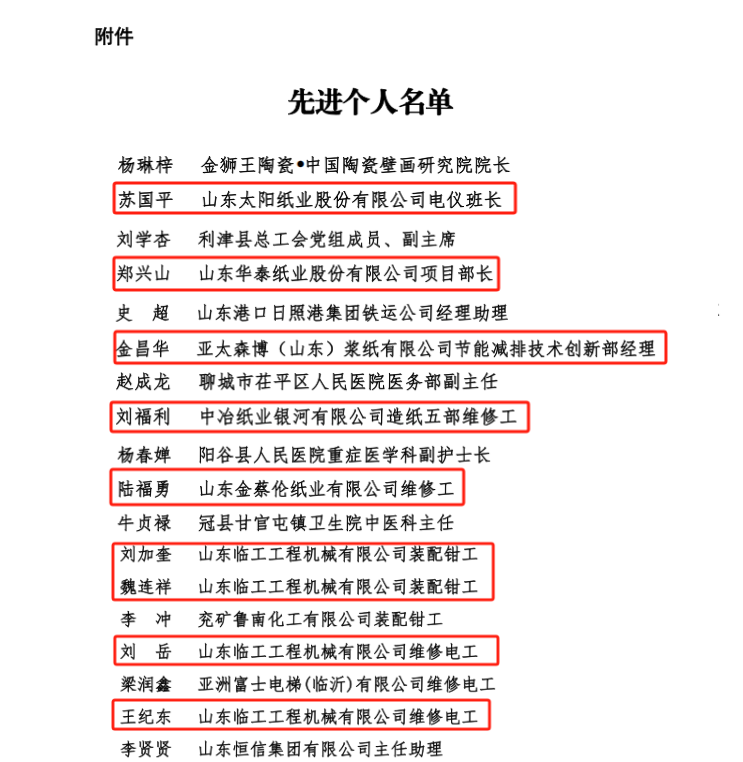 12月23日,山东省总工会印发《关于表扬2024年全省劳动和技能竞赛先进个人的通报》,对2024年在全省劳动和技能竞赛中表现突出的959名个人进行通报表扬。协会会员单位:山东太阳纸业股份有限公司电仪班长 苏国平、山东华泰纸业股份有限公司项目部长 郑兴山、亚太森博(山东)浆纸有限公司节能减排技术创新部经理 金昌华、中冶纸业银河有限公司造纸五部维修工 刘福利、山东金蔡伦纸业有限公司维修工 陆福勇,山东临工工程机械有限公司装配钳工 刘加奎、魏连祥,维修电工 刘岳、王纪东光荣上榜,其中苏国平为第六届山东省造纸行业职业技能竞赛冠军。协会代表全体会员向以上获得表扬的企业和职工表示热烈祝贺!